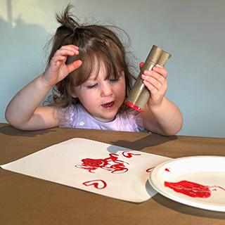 6. Have your child dip the end of their heart-shaped tube into the paint. They can use this as a stamp to create their pretty artwork on their cardstock paper or card.